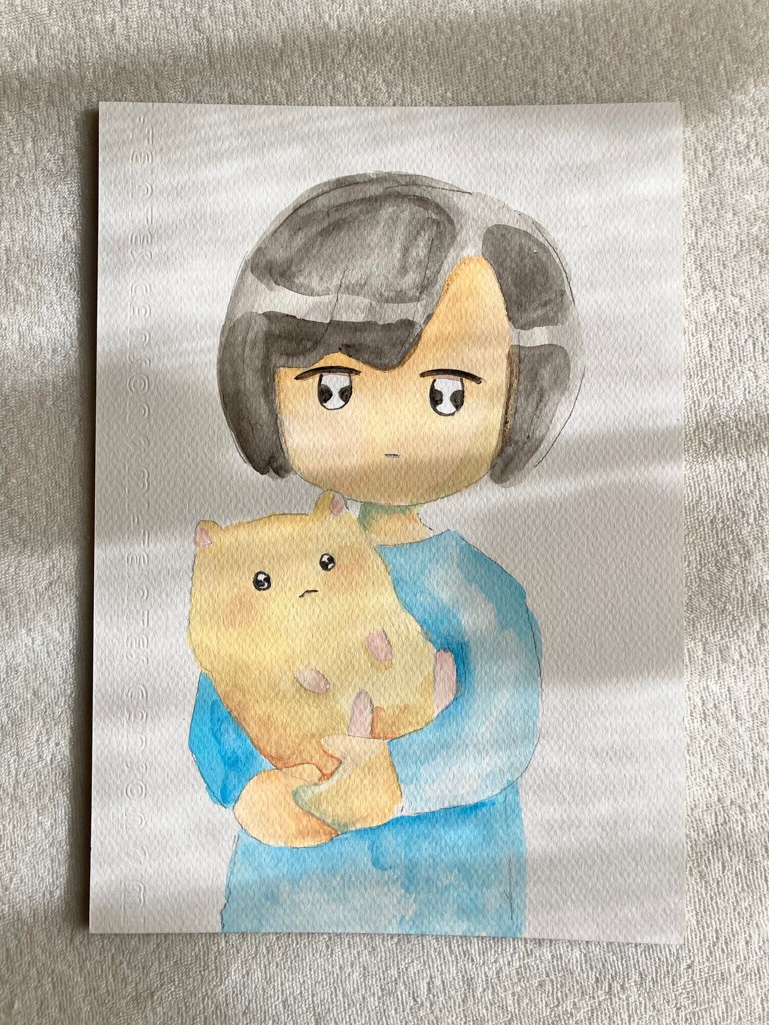 B5サイズのイラストボードに鉛筆とアクリル絵の具で描きました。